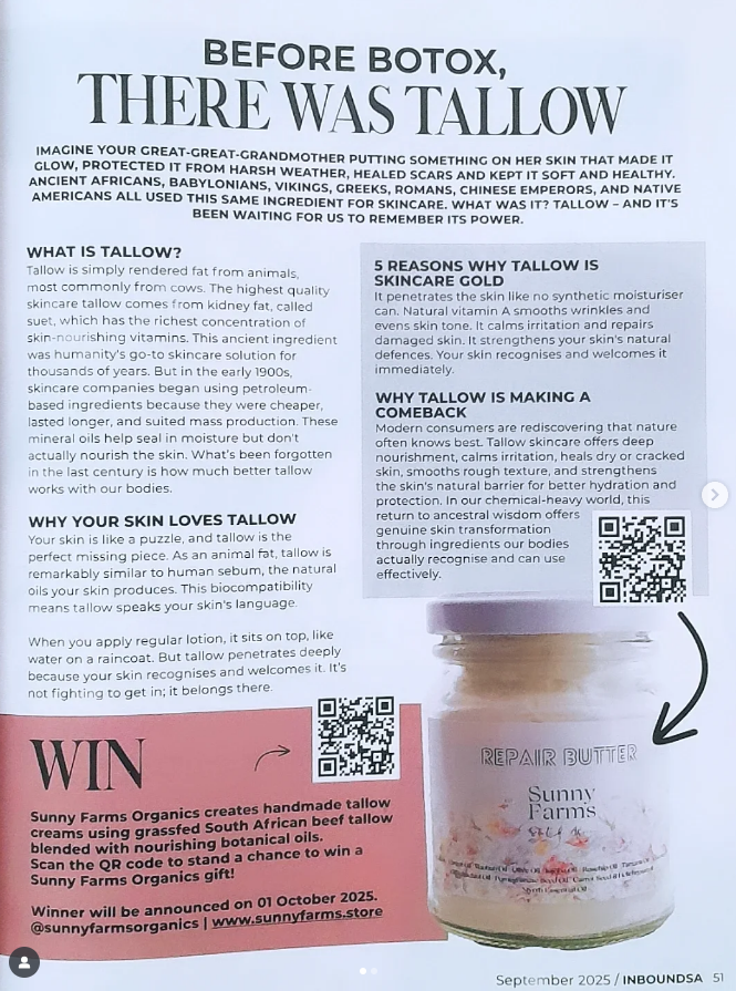 Local grassfed, grass-finished and pasture raised beef kidney tallow blended with cold-pressed botanical oils. No added hormones, routine antibiotics, synthetic fragrances, fillers, toxins, or preservatives.